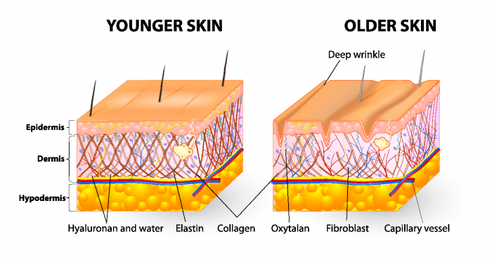 During the natural aging process both elastin and collagen production decline. Since our body produces less collagen, our skin looks less firm and toned. In addition, the middle layer of the skin, the dermis, has a more difficult time retaining moisture. Dryness and a thin texture are two qualities that result in a saggy skin appearance. This loss in collagen production and thinning of the skin contributes to a change in skin texture and firmness, leading to a saggy appearance.